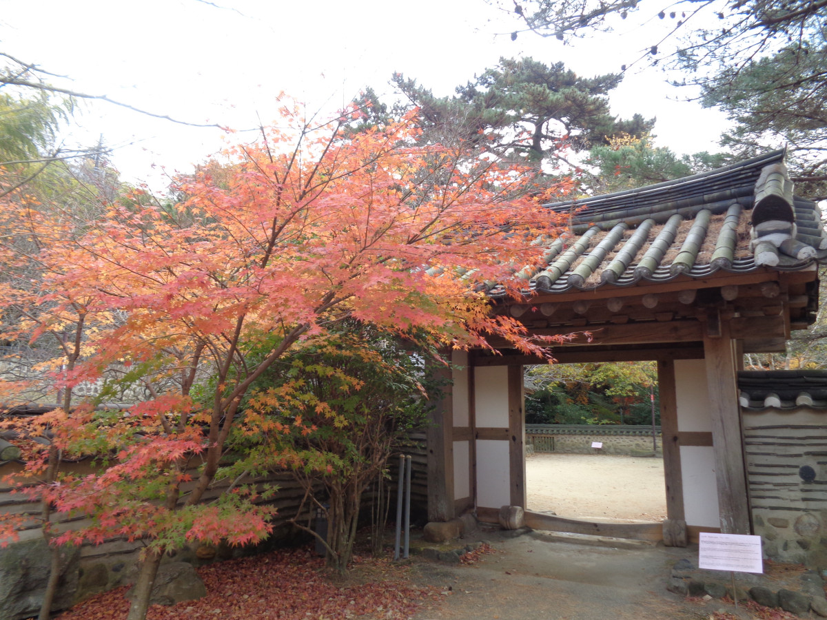 駐杖橋(赤い橋)と韓国庭園の付近は、色づきが早い木がありますが、全体的にはまだ緑が多いです。
