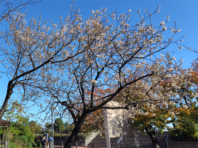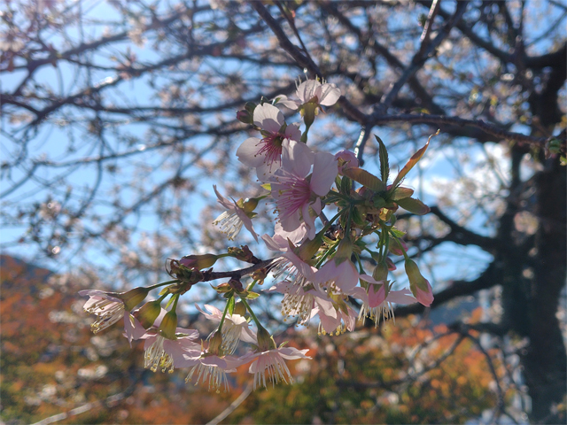 11/26撮影親水公園のヒマラヤ桜(全2本)が見頃になりました!紅葉(大寒桜の葉)をバックに咲く華憐な桜をぜひご覧ください。【親水公園 第一工区】住所/熱海市渚町地先(親水公園第一駐車場付近)