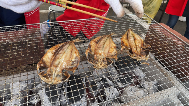 天日干しの脂ののったアジの干物を炭火で焼き来場者に振舞われます!(各日2500枚予定)