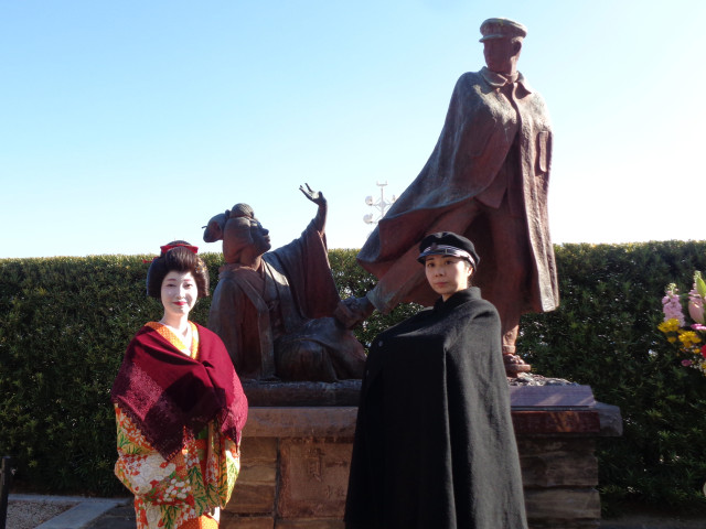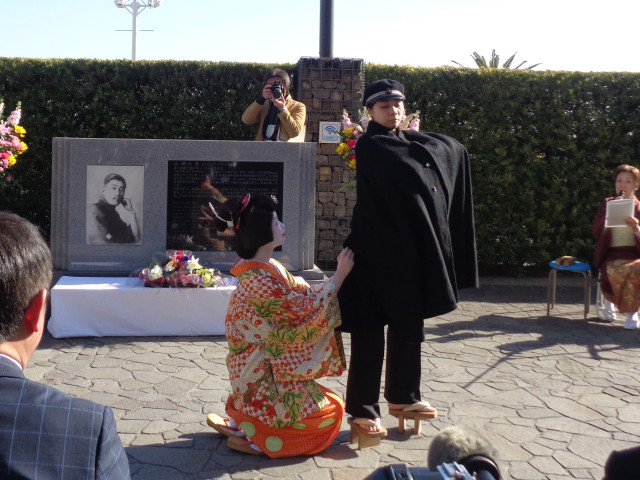 出席者による献花の後、熱海芸妓による芝居仕立ての舞踊「金色夜叉」が、貫一役を一代さん、お宮役を琴千代さん、地方:小文さん・露子さんにより披露され、集まったお客様たちはカメラやスマホで撮影し、大きな拍手がおくられました。