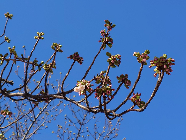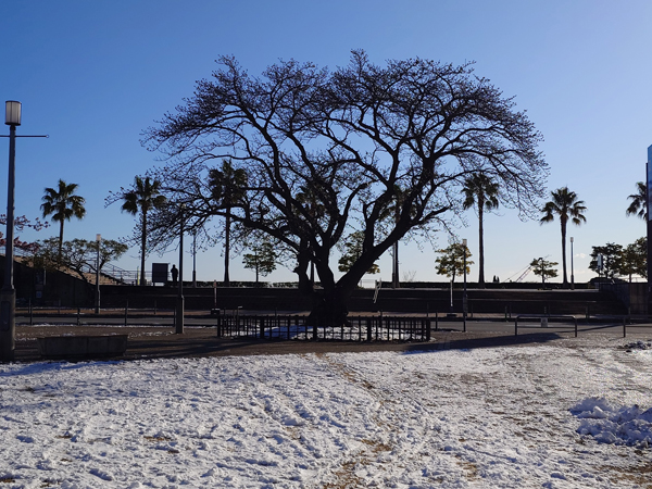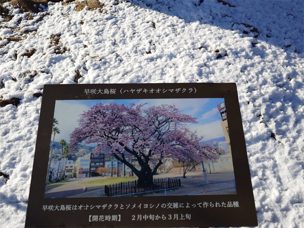 昨日2/8(日)は朝から深々と雪が降り、熱海でも十数年に一度の積雪となりました。熱海の海岸沿いまで雪が積もるのは大変珍しい光景で、交通機関・観光施設など各所に影響が出ています。。。そんな中、2/9(月)朝、渚小公園にある早咲き大島桜が開花し始めているのを発見しました!この大きな桜は、オオシマザクラとソメイヨシノ交雑によって作られた品種で、開花時期は2月中旬~3月上旬、とされています。今年も順調に開花が進めば2月中旬~下旬に見頃を迎えそうです。【渚小公園】住所/熱海市渚町(親水公園第三工区前)