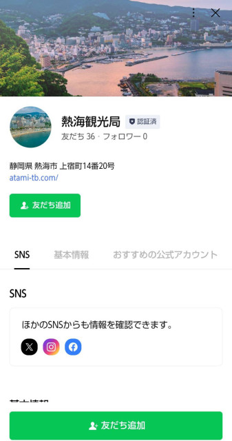 熱海観光局にて公式LINEが開始されます。この公式LINEでは、観光案内・イベント情報の提供のほか、市民・別荘所有者様向け特典情報の発信、事業者様への情報掲載窓口として開設されます。ご興味のある方はぜひ「友だち登録」してご活用ください!熱海観光局LINEアカウント名「熱海観光局」@355hduvr2026年2/16運用開始※同LINE初回特典として、絶景カフェで使えるコーヒーチケット5枚付き「MOA美術館年間パスポート」の販売があります。(あわせて、坂東玉三郎氏による公演、東儀秀樹氏・千住真理子氏コンサート、それぞれの限定先行販売にお申込みいただけます)