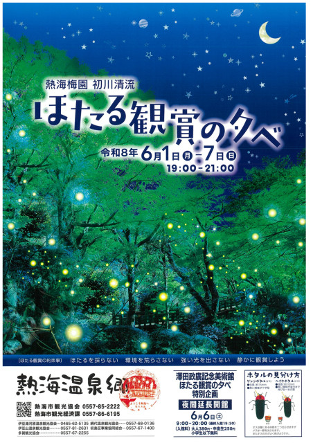 日本には50種類程度の蛍がいると言われていますが、熱海で放流するのは「ゲンジボタル」で、2~3センチになった終令幼虫を放流しています。この幼虫たちがやがてサナギを経て、5月下旬から6月上旬にかけて成虫となり淡い光を放ちます。ライトやカメラのフラッシュは当てず、自然の光をお楽しみください。