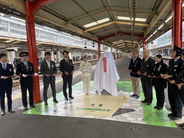 除幕式では、來宮神社の雨宮宮司によるお祓い・祈願の後、JR東日本熱海駅荒屋駅長をはじめ、中島熱海市観光協会長ら関係者が幕を取りお披露目となりました。
