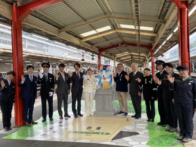 今回ホームに設置されたのは、「あたゆ丸」が神社の狛犬のように台座の上に座っているモニュメントで、床面には熱海駅名の入った賽銭箱がトリックアートとして描かれています。また、近くの柱も鳥居に見立て朱色に塗装されました。