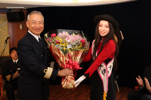 同日、船内で行われた歓迎セレモニーでは、斉藤熱海市長・静岡県熱海土木事務所西原所長そして熱海観光大使:本田が、にっぽん丸の関谷船長・戸崎機関長・川野ゼネラルマネージャーに感謝状や(にっぽん丸をイメージした)花瓶、そして花束を贈呈。関谷船長から熱海市側へ感謝の言葉と、熱海港に着岸するにっぽん丸の絵が贈られました。