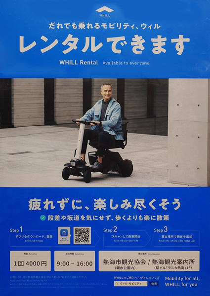 坂道が多い熱海でも快適に散策いただけるよう、熱海市観光協会と、熱海観光案内所(駅ビル「ラスカ熱海」1F)にて、最新型運転モビリティ「WHILL(ウィル)」の貸し出しを開始しました。