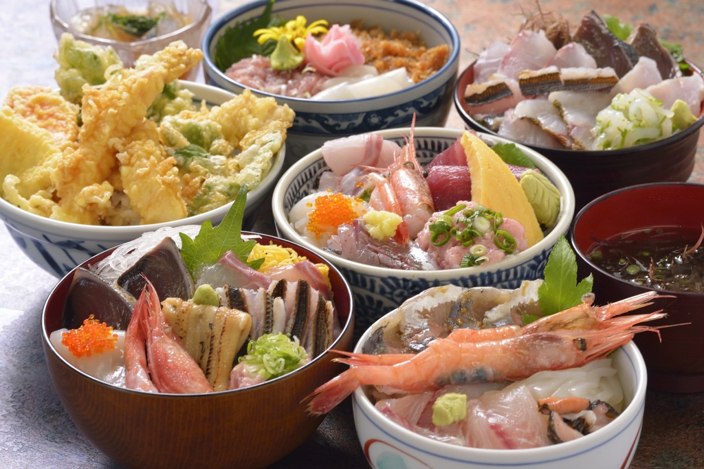 初島区事業協同組合の漁師が営む食堂を中心とした島内の16店舗が、獲れたての地魚やイカ、エビ、伊豆の名産野菜アシタバなど、旬の食材をふんだんに使ったオリジナル丼メニューをご提供します!