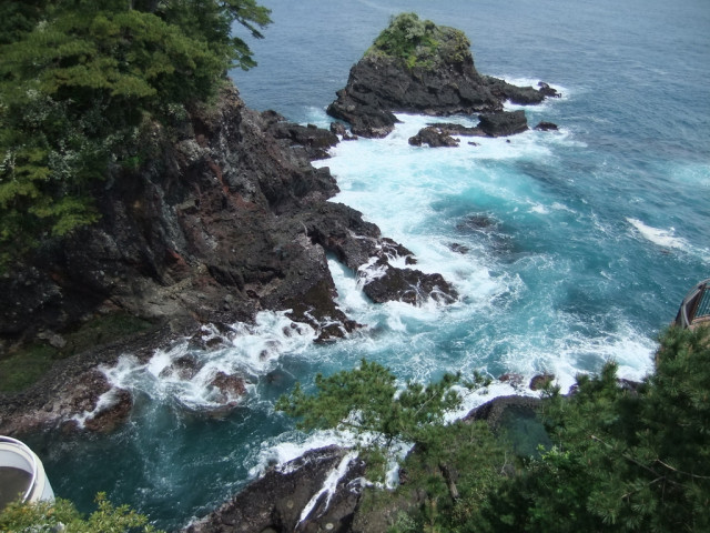 崖の高さは80メートル。荒波が刻んだ兜岩・基盤岩・烏帽子岩・弁天岩など奇岩が並び、海上には初島や大島が浮かびます。